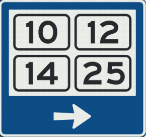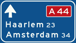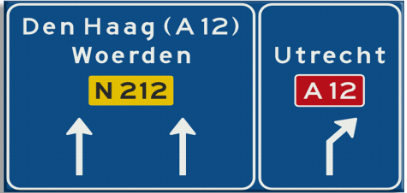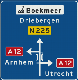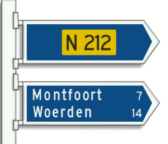 Dit bord staat langs gewone wegen (niet-snelwegen). Het geeft de richting naar andere plaatsen (interlokale doelen) en het routenummer van die weg aan.
