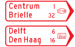Wegwijzer voor fietsers en bromfietsers (handwijzer), met lokaal doel, interlokaal doel, stedelijk fietsroutenummer (boven), en met interlokale doelen en interlokaal fietsroutenummer (onder).
