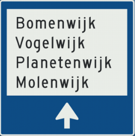 Voorwegwijzer binnen de bebouwde kom met interlokaal doel, lokaal doel, een dagrecreatiecentrum, objecten en stadsroutenummers.