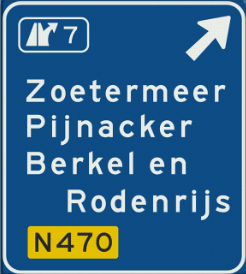 Het geeft aan dat er verderop een afslag is, bijvoorbeeld naar de N470, afrit nummer 7, richting Zoetermeer, Pijnacker, Berkel en Rodenrijs.