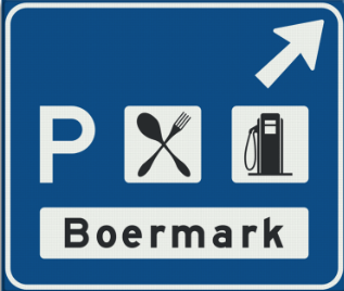 Dit bord staat langs de autosnelweg bij een afrit en toont de richting naar een plek waar je kunt stoppen of pauzeren, zoals een parkeerplaats of rustplaats. Het bevat ook de naam van de parkeerplaats en symbolen die aangeven welke voorzieningen er zijn (bijv. tankstation, restaurant).