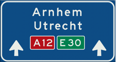 Een lage beslissingswegwijzer staat langs de autosnelweg en geeft de doorgaande richting, belangrijke plaatsen (interlokale doelen) en het routenummer aan.
