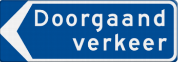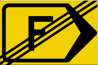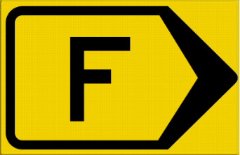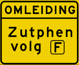 Bij wegwerkzaamheden wordt hiermee een tijdelijke omleiding aangekondigd. Volg de borden met een letter, zoals F. Het volgen van de omleiding is niet verplicht.