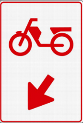 Bromfietsers moeten het bord passeren aan de kant die de pijl aangeeft. Ze moeten bij dit bord van het fietspad af de weg op, of andersom.